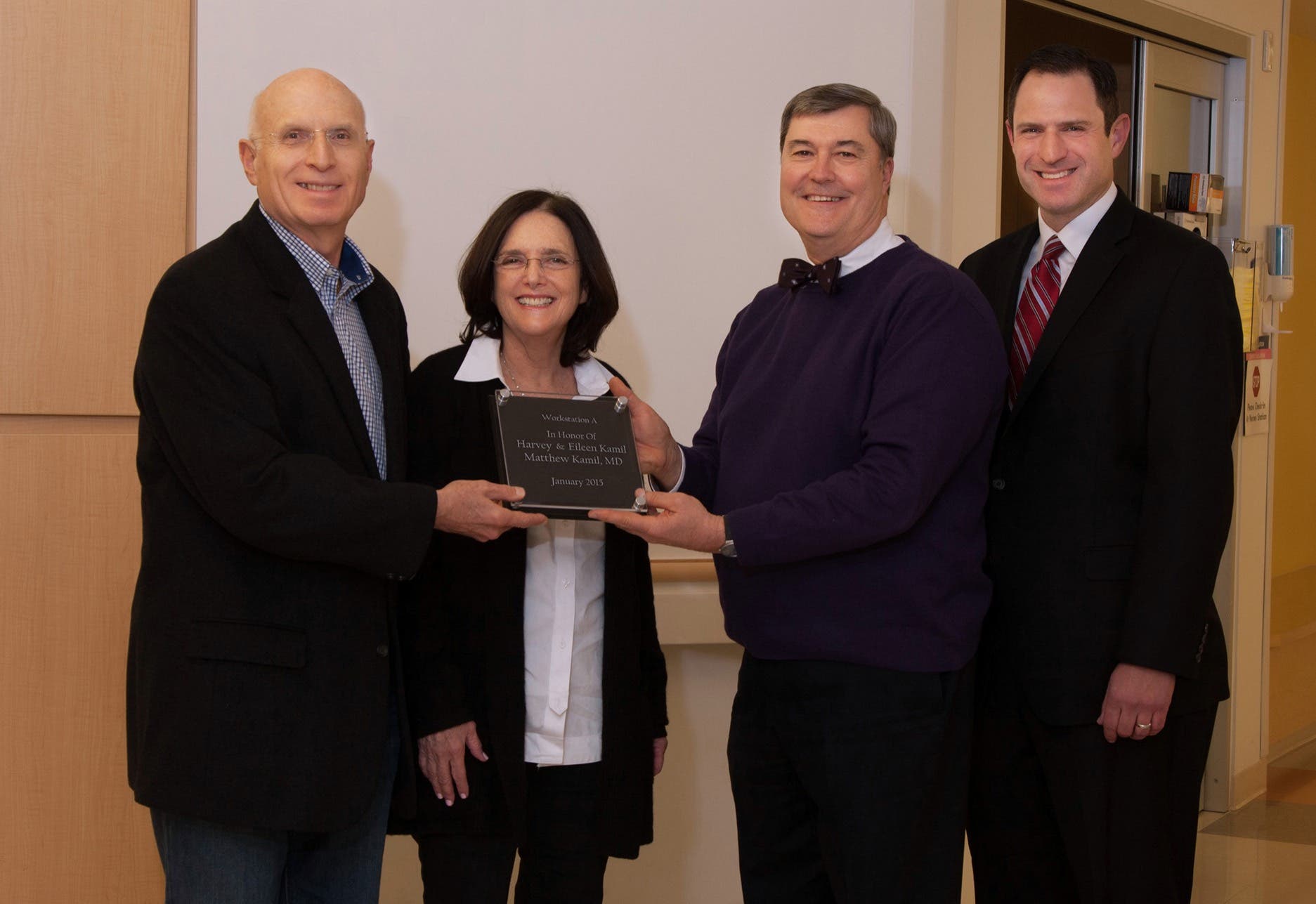 Caption: Left to Right: Mr. and Mrs. Harvey Kamil, John Marzinzik, Frisbie President/CEO, and Dr. Matthew Kamil pictured with dedication plaque.