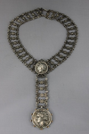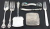 Russian Niello belt buckles. Sterling compots and vases. Sterling spoons, vanity sets, and Gorham perfume bottles. Antique silver plate trays and tureens. An antique finely carved coral Neapolitan brooch of Bacchus / Dionysus. An 18kt gold and aqua marine ring. An amethyst and diamond 14kt gold ring. Jade, lapis lazuli, malachite, and tiger's eye beaded necklaces. A Victorian gold and enamel bracelet. Michaela Frey enamel cuff bracelets. Many sterling rings.