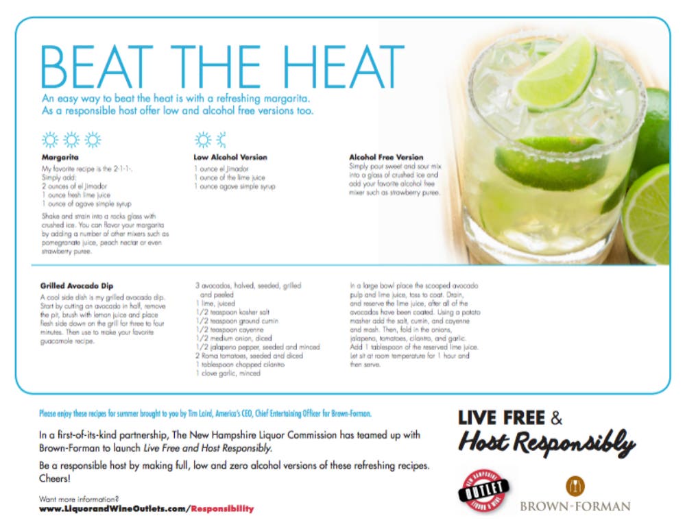 The New Hampshire Liquor Commission and Brown-Forman are encouraging safe and responsible alcohol consumption this summer season by providing lounge and restaurant owners and the general public creative resources focused on responsible alcohol service and consumption, according to a press statement.