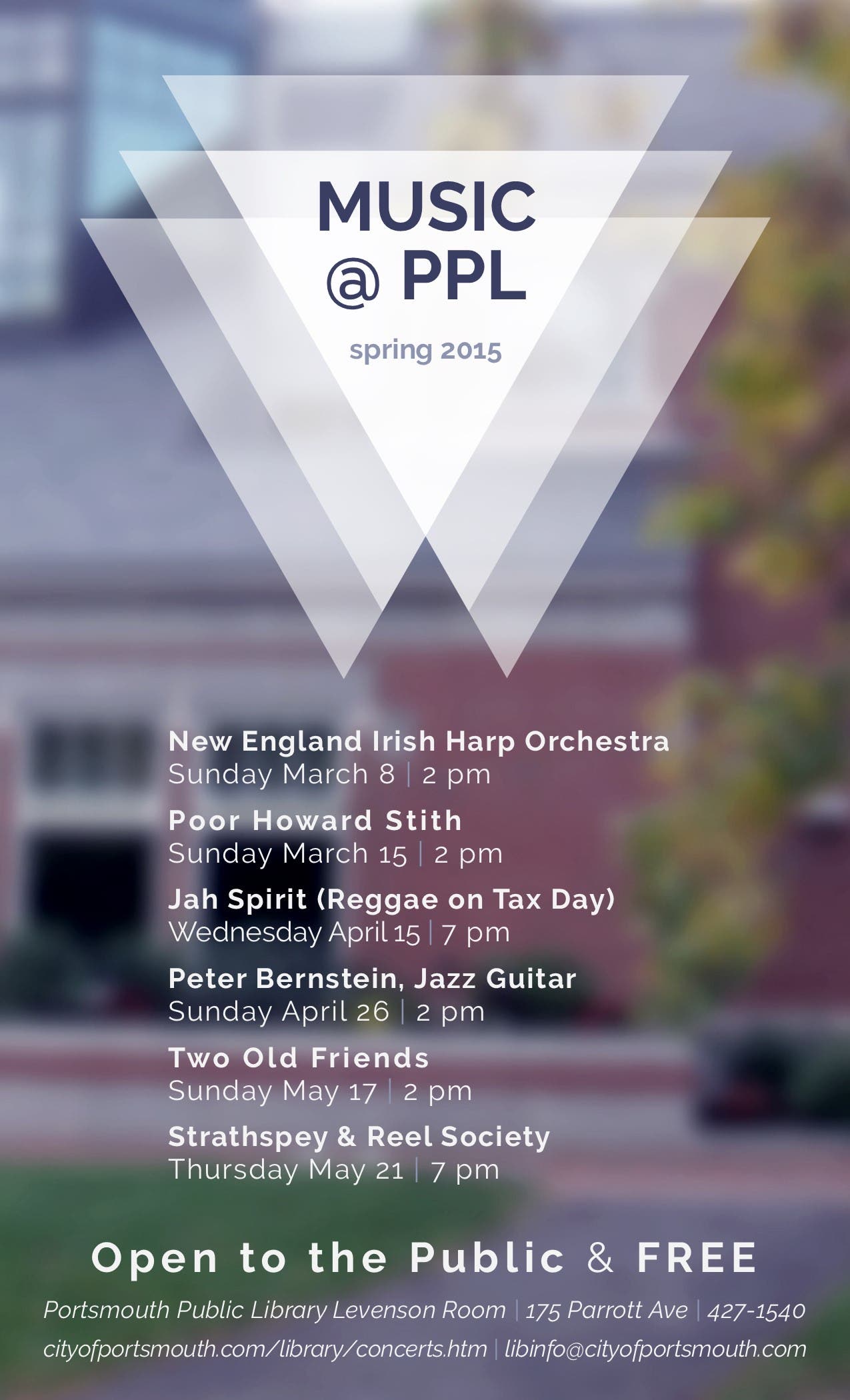 The Portsmouth Public Library is proud to present a rockin’ music series for Spring 2015, and all concerts are free of charge. Whether you like the blues, jazz, Celtic, Irish, reggae, folk or anything other kind of music, there’s something for you at PPL!