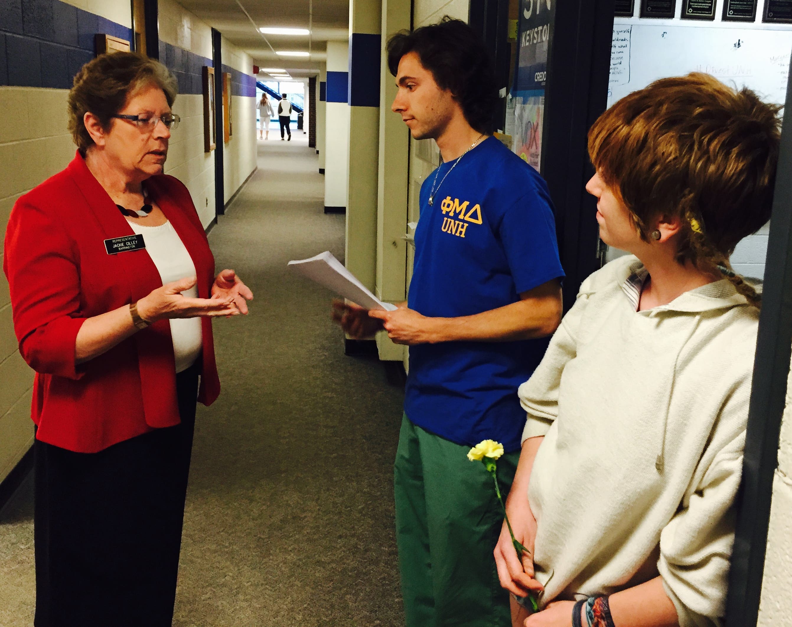 Caption: UNH Peace & Justice League members Jon Brown and Amanda Chisholm talk with adjunct professor and Representative Jackie Cilley, D-Barrington, after yesterday’s event.