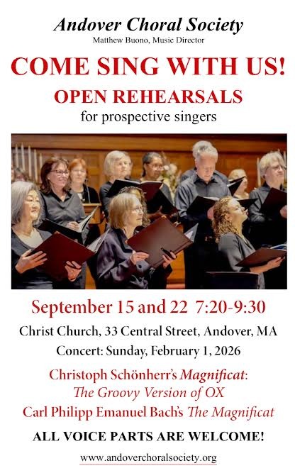 Singers of all voice parts are welcome to join in our open rehearsal on Monday, 9/22, at 7:20 pm.