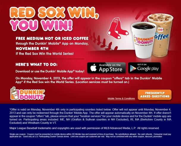 Red Sox win, you win! To celebrate the Boston Red Sox World Champions, Dunkin’ Donuts, America’s all-day, everyday stop for coffee and baked goods, will treat fans who have the Dunkin’ Mobile® App to a coupon for a free medium hot or iced coffee on November 4 at participating Dunkin’ Donuts locations. The offer is available and redeemable only on November 4 through the “My Offers” tab of the Dunkin’ Mobile App, the brand’s app for mobile payment and gifting, and is valid for guests only in Massachusetts (except Berkshire County), New Hampshire, Rhode Island, Maine, and Vermont (Windham County only). This special offer to honor the Red Sox will feature the team’s logo next to the message on the “My Offers” tab of the Dunkin’ Mobile App. For additional terms and conditions, and for details on how to receive a free medium hot or iced coffee, visit www.ddcoffeeoffer.com.