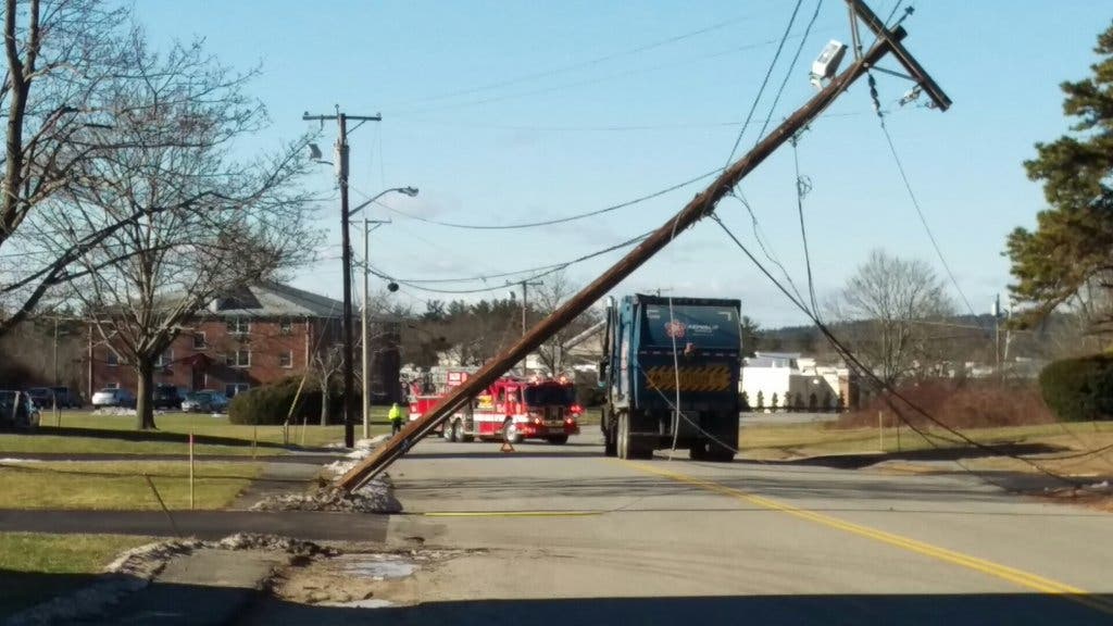 SALEM, NH - Salem Police and Fire and Rescue teams are on Oakridge Avenue where a garbage truck struck and knocked down a utility pole. According to alerts online, the street is closed at Sand Hill Road.