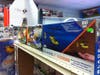 The bomber hanging above the narrow cooridors of shelves took Horton 80 hours to assemble. The Biplane? 60 hours.