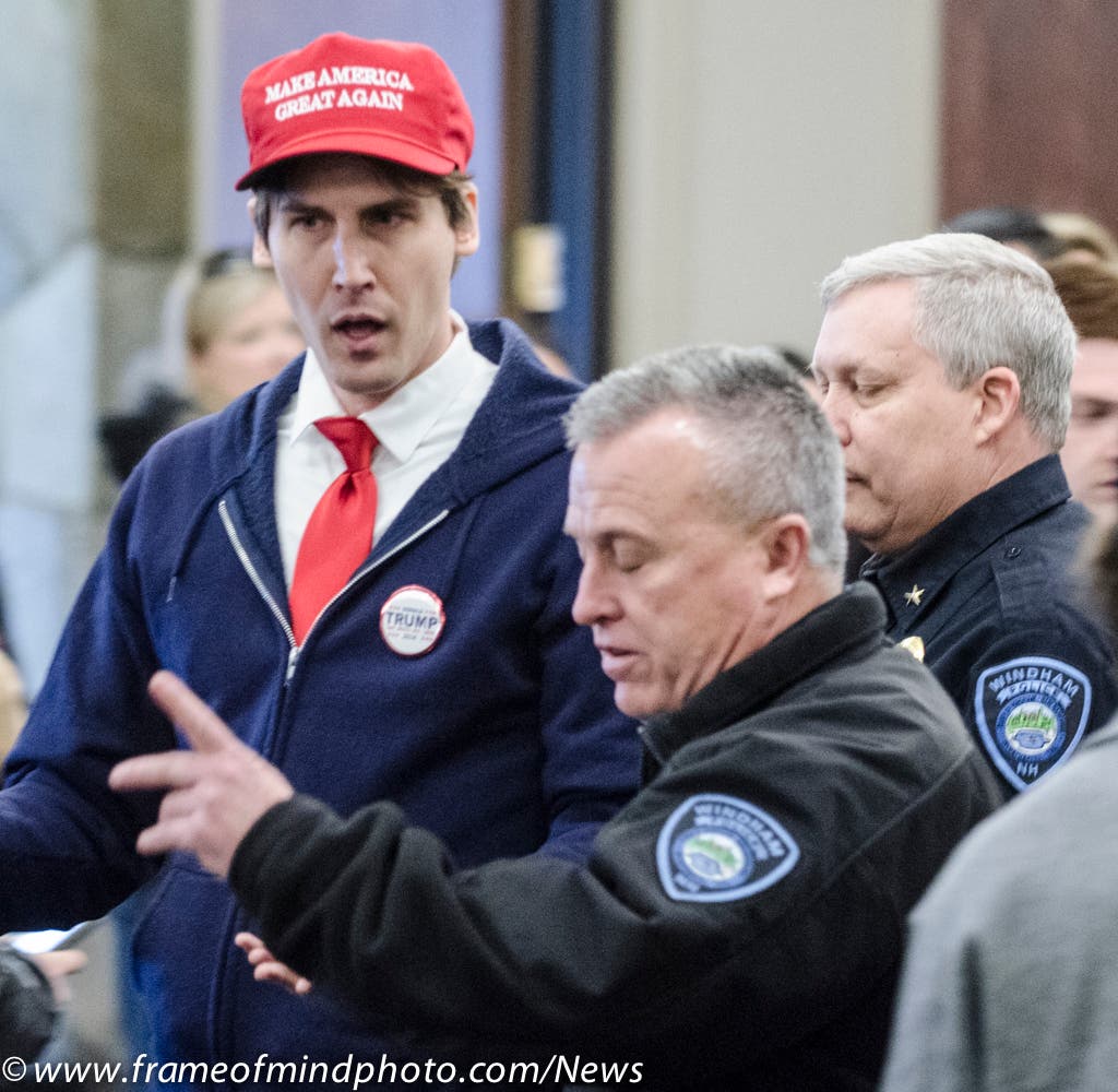 WINDHAM, NH - As reported on the New Hampshire Patch Politics Twitter account two days ago, a political prankster who was cracking wise was booted from a Donald Trump town hall meeting in Windham.