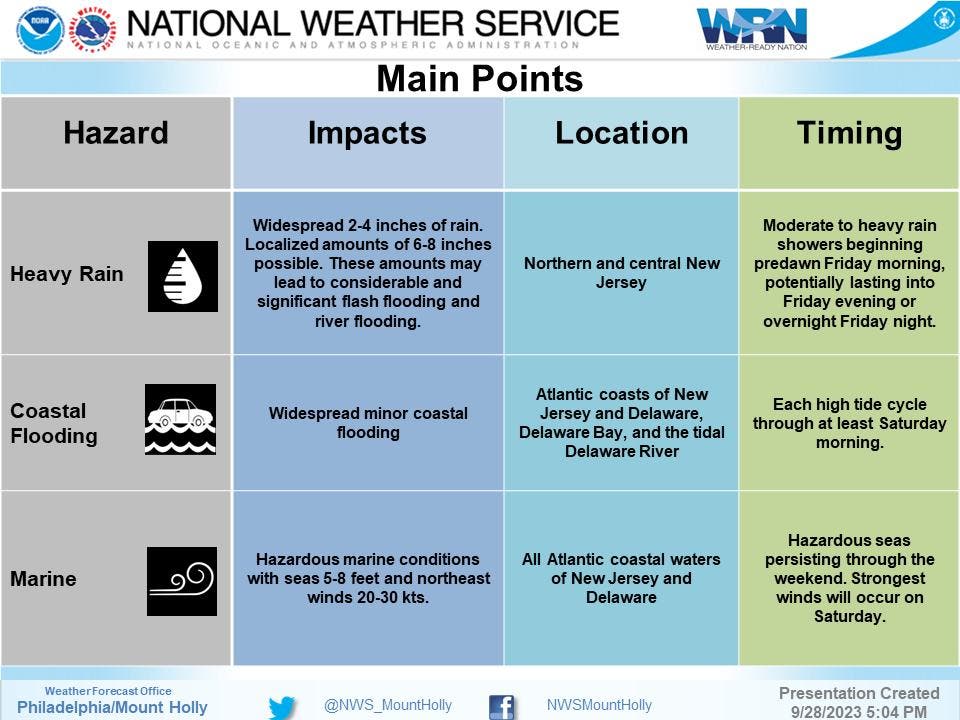 Through Friday night, forecasters said rainfall and scattered showers will continue to affect areas near the coast, "especially over coastal Ocean and Monmouth County where we are most concerned about flooding."