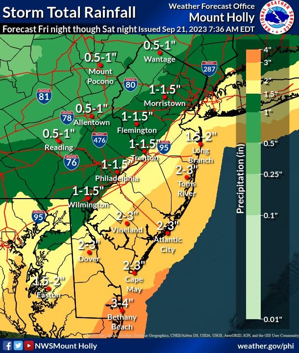 As of Thursday at 1:30 p.m., NWS forecasters predict 2 to 3 inches of rain in Vineland, Atlantic City, Cape May, and Toms River, with up to 2 inches in Long Branch and Trenton, and parts of Central and South Jersey. Those north of Trenton and close to the New York City metro may see between 1 and 1.5 inches of rain. Far northwest Jersey may see under 1 inch of rain.