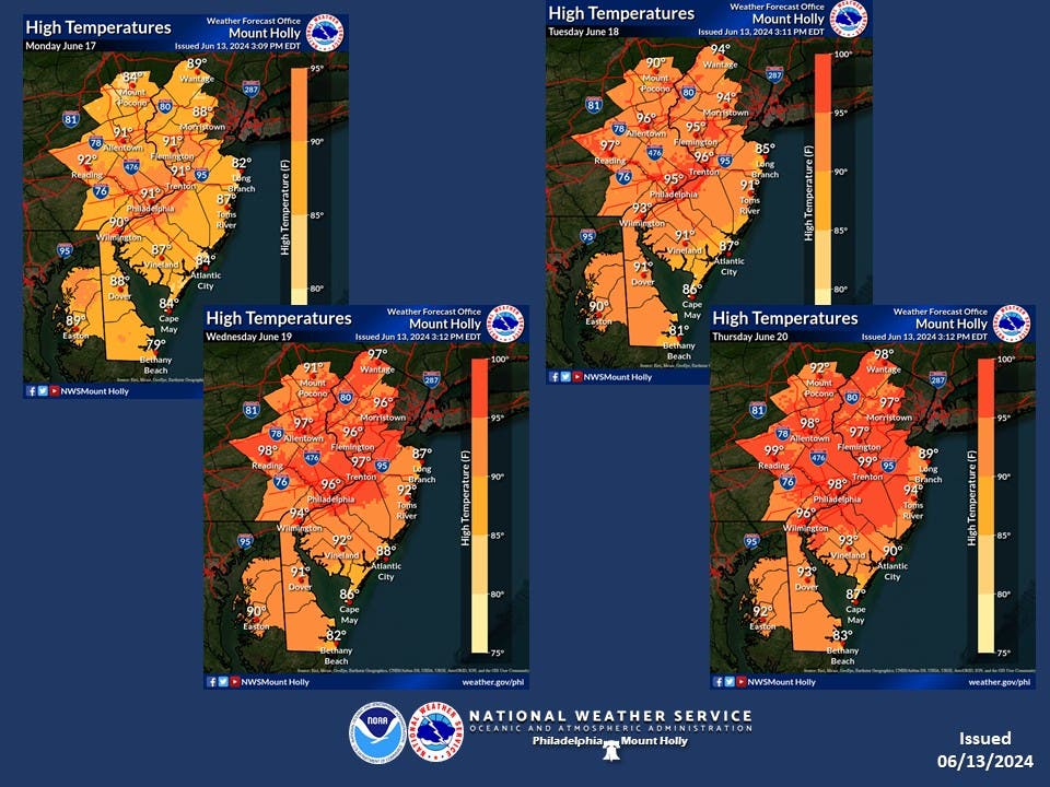 On Wednesday and Thursdays, areas in North and Central Jersey could see temperatures of nearly 100 degrees. Areas at the shore tend to be slightly cooler, but some will still exceed the 90s by the end of the week.