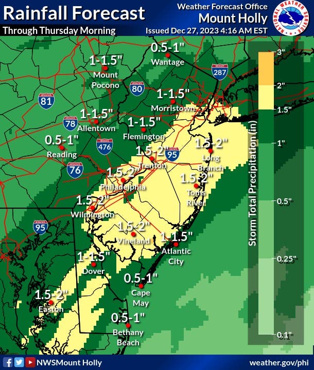 Here's the timeline for rain across New Jersey Wednesday into Thursday and beyond, from the National Weather Service: