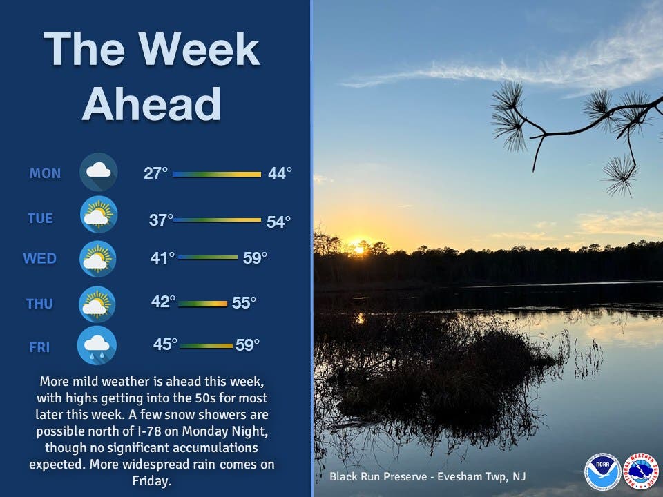 Additionally, those north of Interstate 78 could see a few snow showers on Monday night, "though no significant accumulations are expected," according to the National Weather Service(NWS).