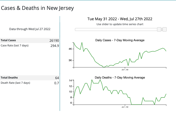 New Jersey averaged 3,752 infections per day in the past week, according to federal data. That's about the same as the prior week's seven-day average of 3,682 but a 40 percent increase of the seven-day average of 2,668 recorded June 18.