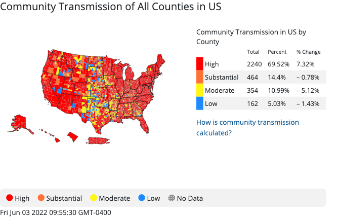 All of New Jersey has high COVID transmission — as does most of the nation, according to the CDC. The map below shows COVID activity levels according to the CDC's prior framework for determining them, which prioritized transmission: