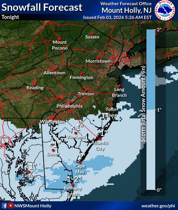 Round one starts Tuesday night as a system could bring a dusting to one inch of snow in parts of South Jersey Tuesday into Wednesday, National Weather Service forecasters said.