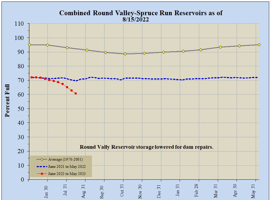 That includes the Round Valley and Spruce Run Reservoirs in Hunterdon County, which were about 60 percent full as of Monday. The reservoirs were about 70 percent full at that time last year and stayed more than 90 percent full during the average summer between 1970 and 2001.