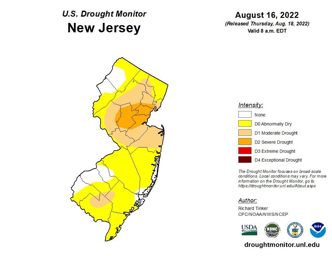 The most recent drought map, released Thursday, shows an expanding portion of New Jersey reaching "severe drought" levels. That typically means poor water quality, declining groundwater, irrigation ponds getting dry and the implementation of outdoor water restrictions, according to the U.S. Drought Monitor.