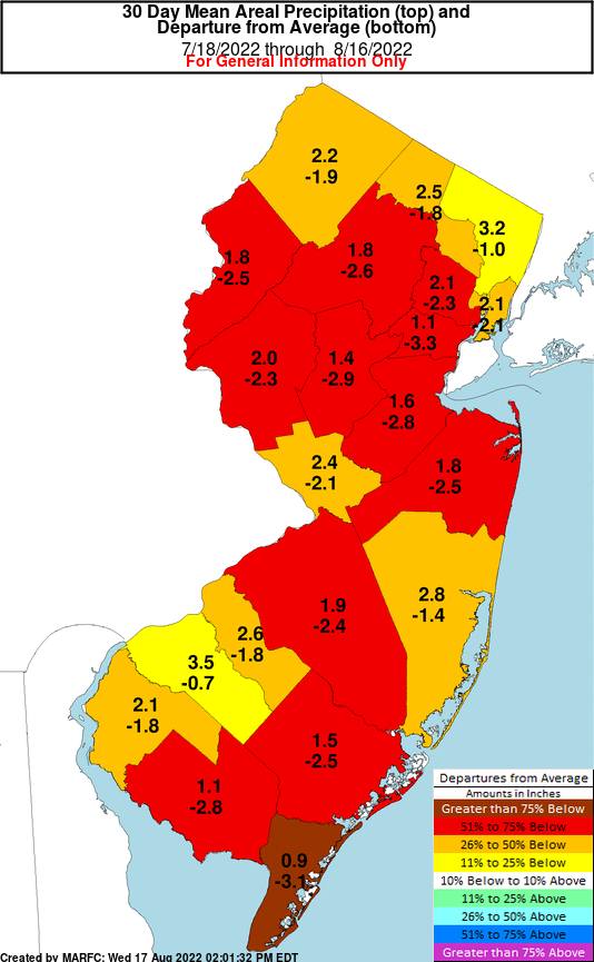 In the past month, much of New Jersey received less than half of the usual rainfall for this time of year. Cape May County fared worst, with 0.9 inches of rain from July 18 through Tuesday — 3.1 inches below the area's mean rainfall during that timeframe.