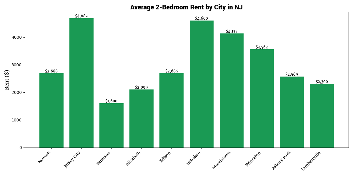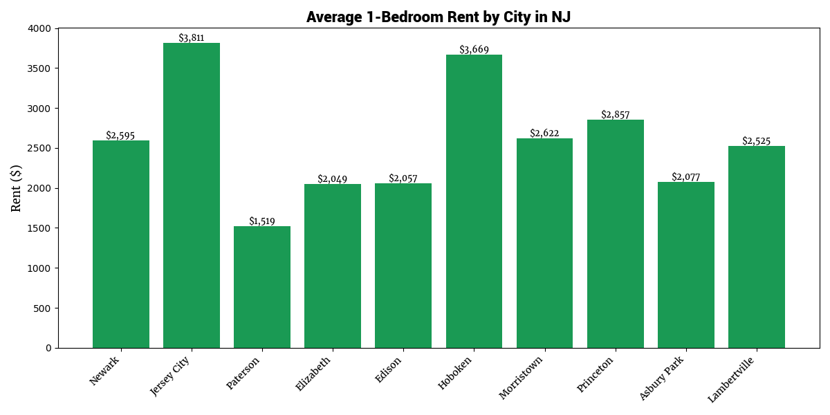 Cities like Jersey City and Hoboken push the envelope, with one-bedroom rents averaging $3,811 and $3,669, respectively.