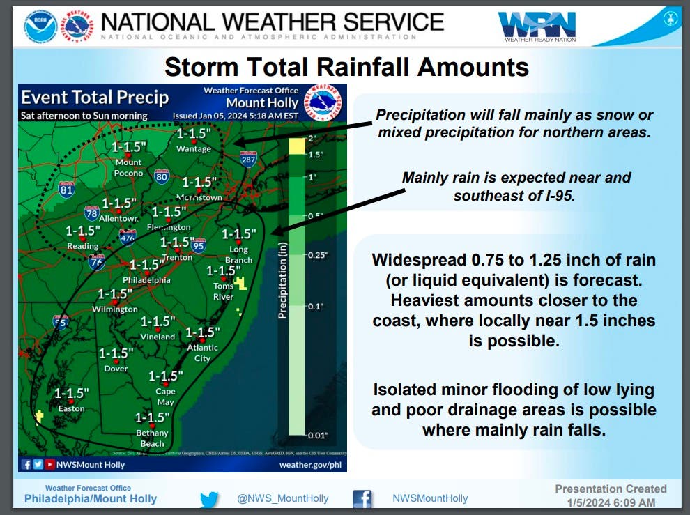 Central Jersey is expected to get about 1 to 2 inches of snow, while mainly rain is expected near and southeast of Interstate 95.
