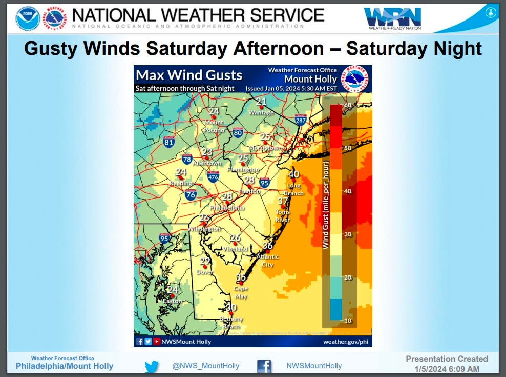 "Minor coastal flooding possible with the Saturday night/Sunday morning high tide along portions of Atlantic coastal New Jersey and Delaware, and Delaware Bay," according to NWS.