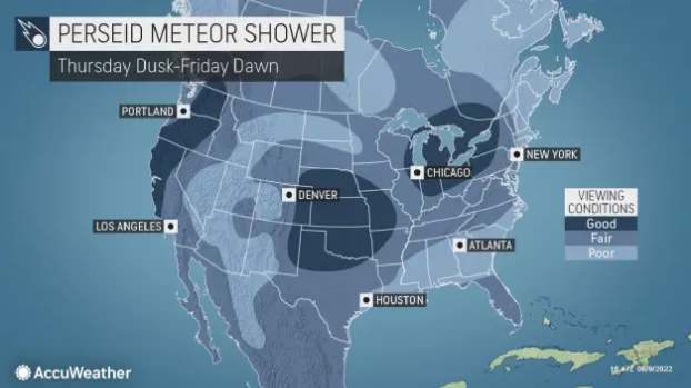 Meanwhile, skywatchers across the Intermountain West, Southeast and the Upper Midwest hoping to witness a shooting star or two might step outside and see only clouds, according to AccuWeather.