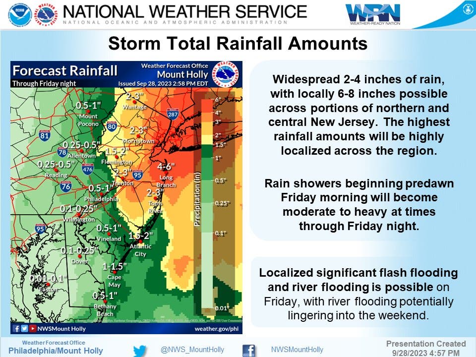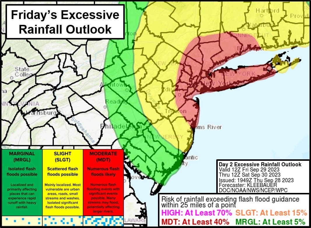 There is a marginal risk for excessive rainfall in most of southeast Pennsylvania, meaning isolated flash flooding is possible, primarily affecting places that "can experience rapid runoff with heavy rainfall."