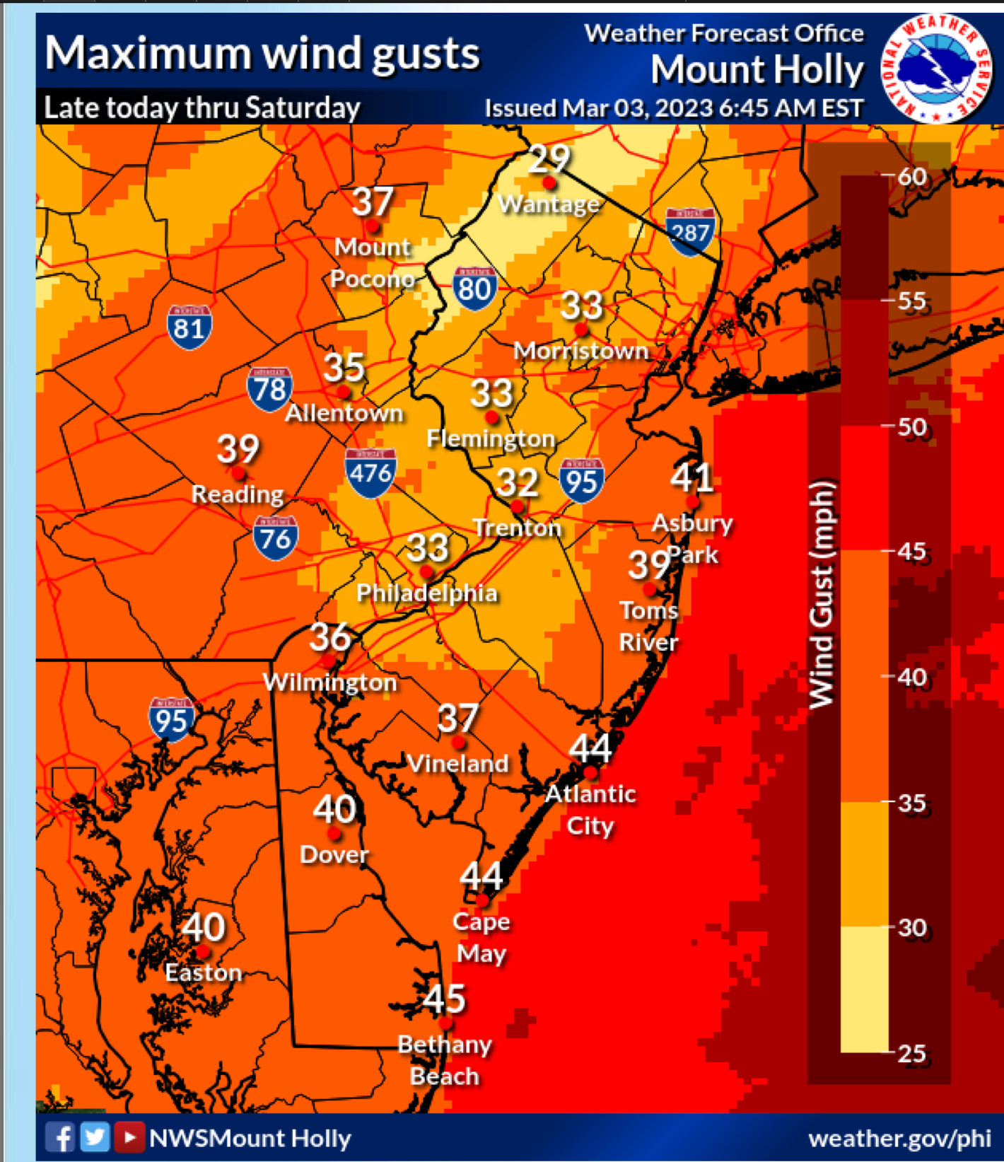 Maximum wind gusts will be close to 40 miles per hour along the Shore and even get close to 50 mph, forecasters said.