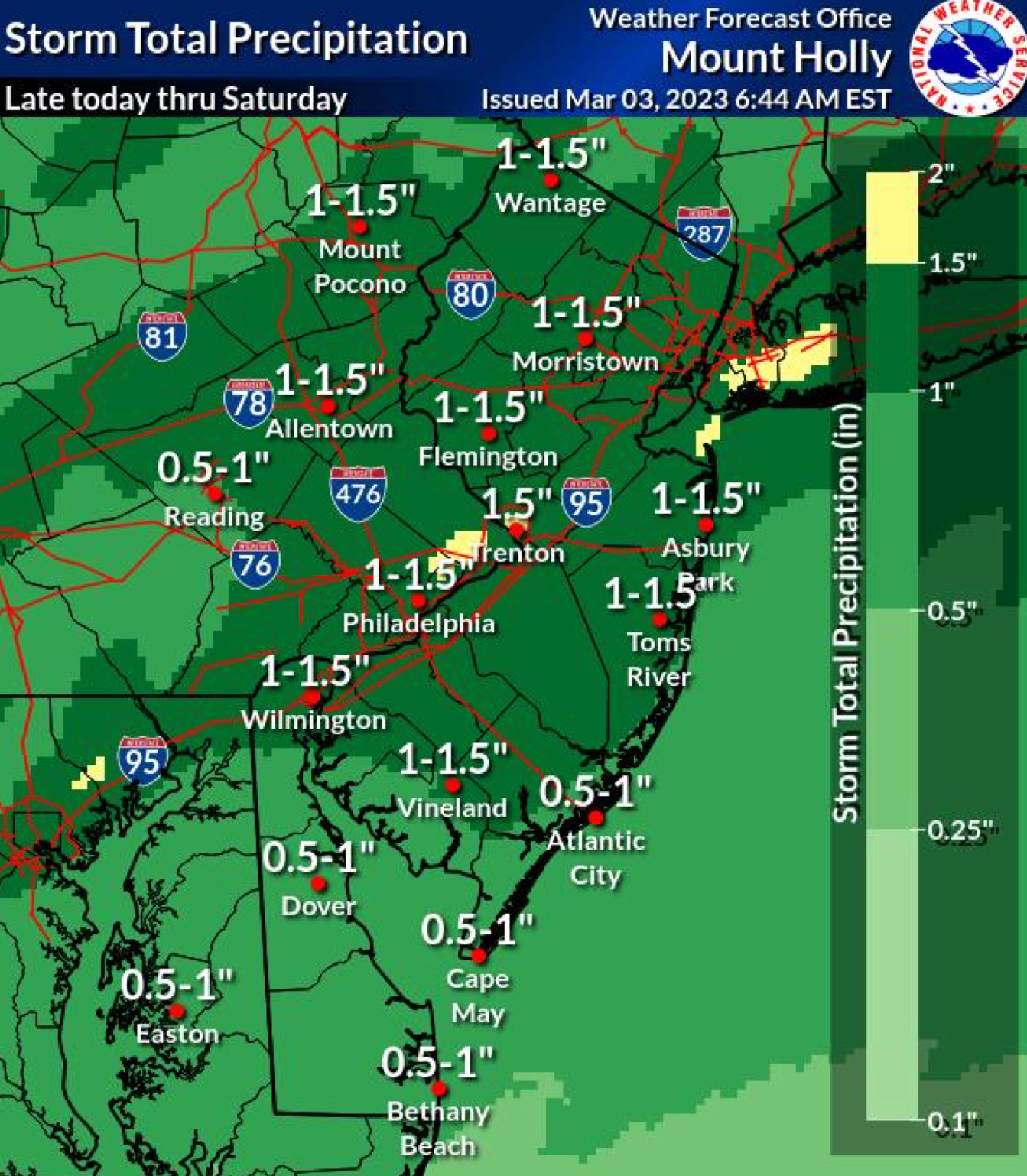 Widespread rainfall around one inch is expected, with locally higher amounts possible in the I-95 corridor and in central New Jersey, per the NWS.