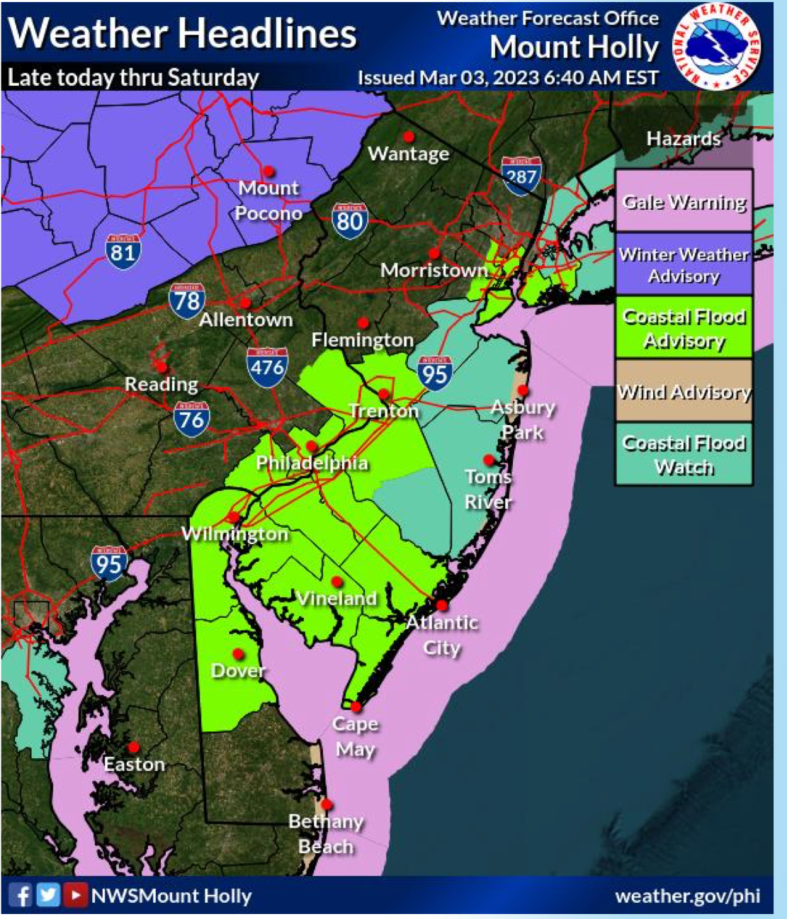 Coastal Flood Advisories and Wind Advisories have been issued for parts of the Atlantic Coast and most of the Delaware Bay.