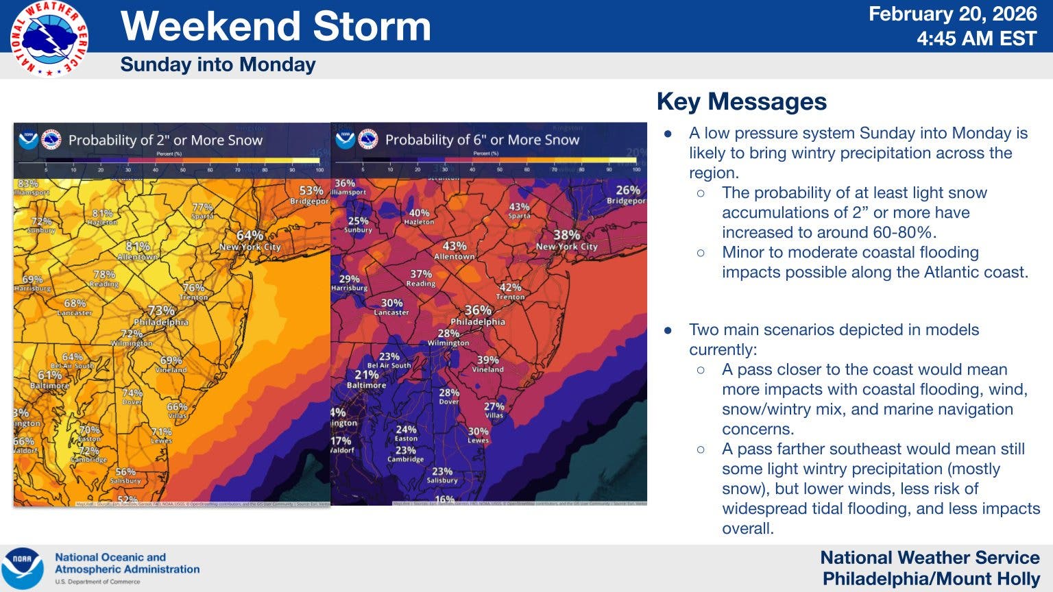 AccuWeather forecasters said that the more likely scenario is for the storm to strengthen later, which would mean less snow for New Jersey. Coastal hazards are also a risk, particularly coastal flooding along the shore.