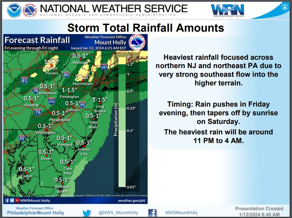 The heaviest rainfall, dropping between 1 to 1.5 inches of rain, will be focused across northern and Central New Jersey and northeast Pennsylvania due to a very strong southeast flow into the higher terrain.