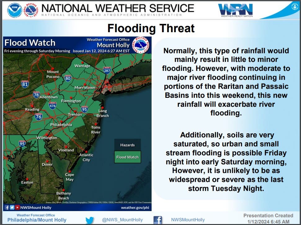 As a result, a Flood Watch has been issued to all counties in North and Central Jersey and some counties in the Southwest portion of the state.