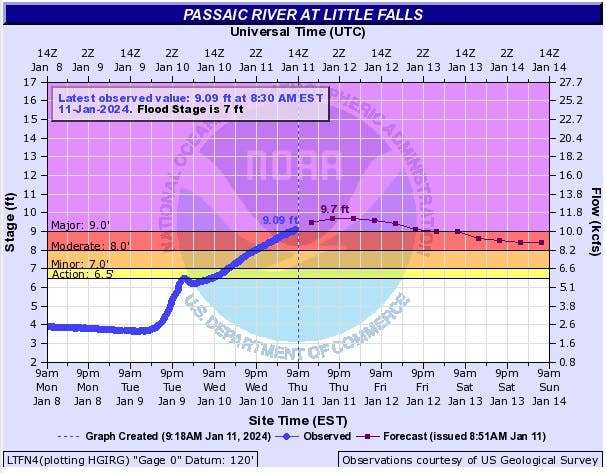 As of Thursday at 9 a.m., the Passaic River at Little Falls has reached the major flood stage at 9.09 feet high and is projected to continue to rise throughout the day, according to the National Weather Service(NWS).