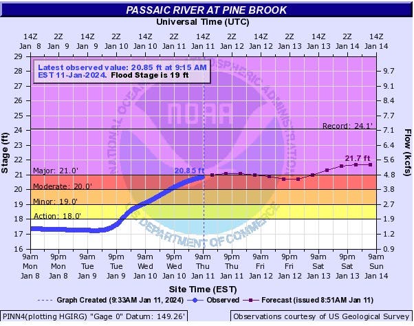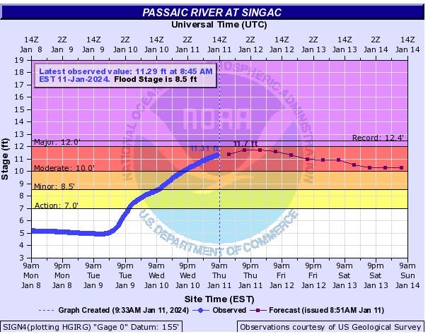 The Passaic River at Signac is currently in the moderate flood stage at 11.31 feet and is also expected to continue to rise throughout the day.