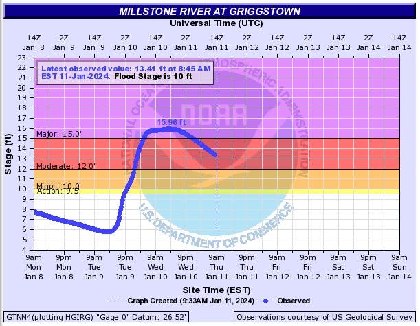 The Millstone River at Griggstown, which crested on Wednesday night, is still at the moderate level at around 13.5 feet.