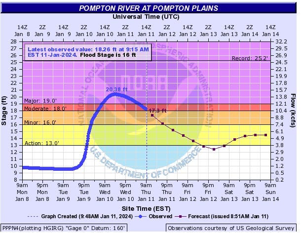 The Pompton River at Pompton Plains is another river that remains at a moderate level at around 18 feet high.