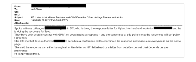 In early October 2014, Heritage Pharmaceuticals received a letter from Congressman Elijah Cummings and Senator Bernie Sanders as part of their joint investigation into price increases in the generic drug industry. Now emails unsealed by the court show that Heritage outside counsel immediately coordinated a response with counsel for Teva and Mylan, according to the release.