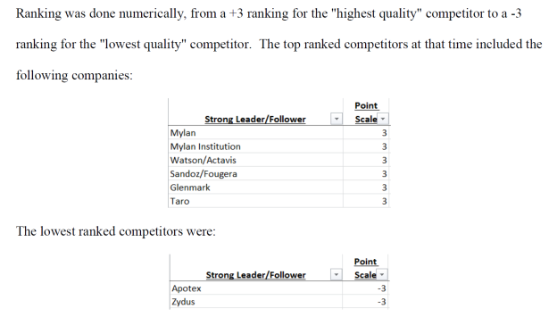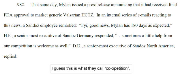 In one series of exchanges, senior executives at Mylan and Sandoz allegedly colluded to divvy up market share for a blood pressure medication. Both companies were the first to launch generic Valsartan on the same day, September 12, 2012, according to the release. Leading up to the launch, records show company representatives spoke at least 21 times by phone to divvy up the market so that each competitor could obtain roughly 50 percent market share. The conspiracy apparently pleased company executives, including a Sandoz executive who states, "sometimes a little help from our competition is welcome as well." Another senior executive replied: "I guess this is what they call 'co-opetition."