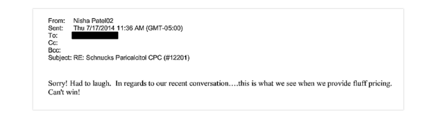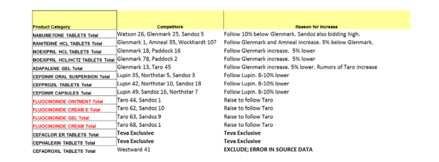 As director of National Accounts at Teva, Nisha Patel's primary responsibility was to implement price increases. The complaint alleges that she did this by systematically conspiring with Teva's competitors and maintained a ranking system of Teva's competitors based on their collusive relationships, with +3 assigned to the most collusive and -3 assigned to the least. Detailed rankings and charts documenting her communication with competitors have been unsealed.