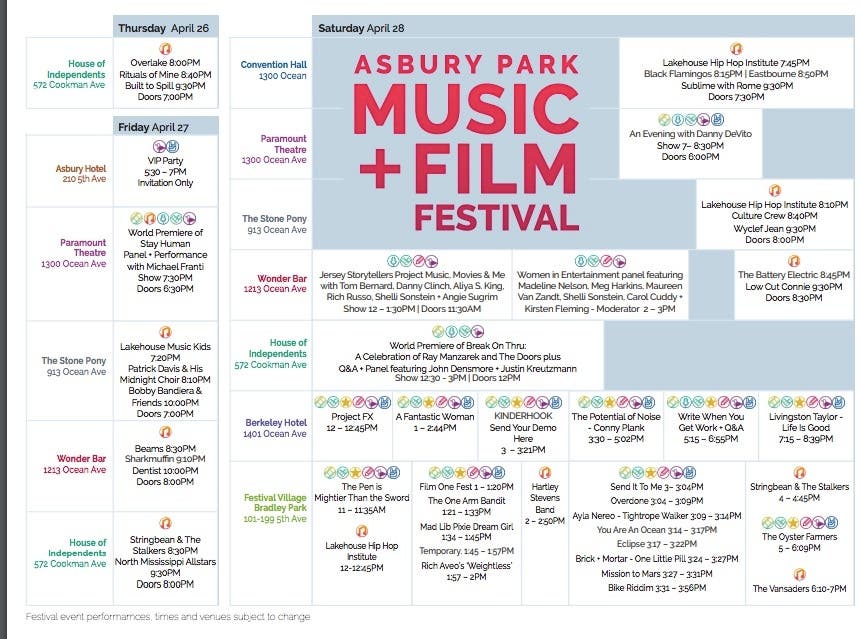 The Asbury Park Music & Film Festival begins this weekend. Below is the complete schedule.