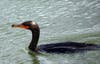 What it is: The double-crested cormorant is a large black diving seabird with a long neck and a slightly hooked beak. The beak and lores – the area around the bird's eyes – are yellow to orange. It can grow to about 35 inches long, with a wingspan of up to 4 feet.