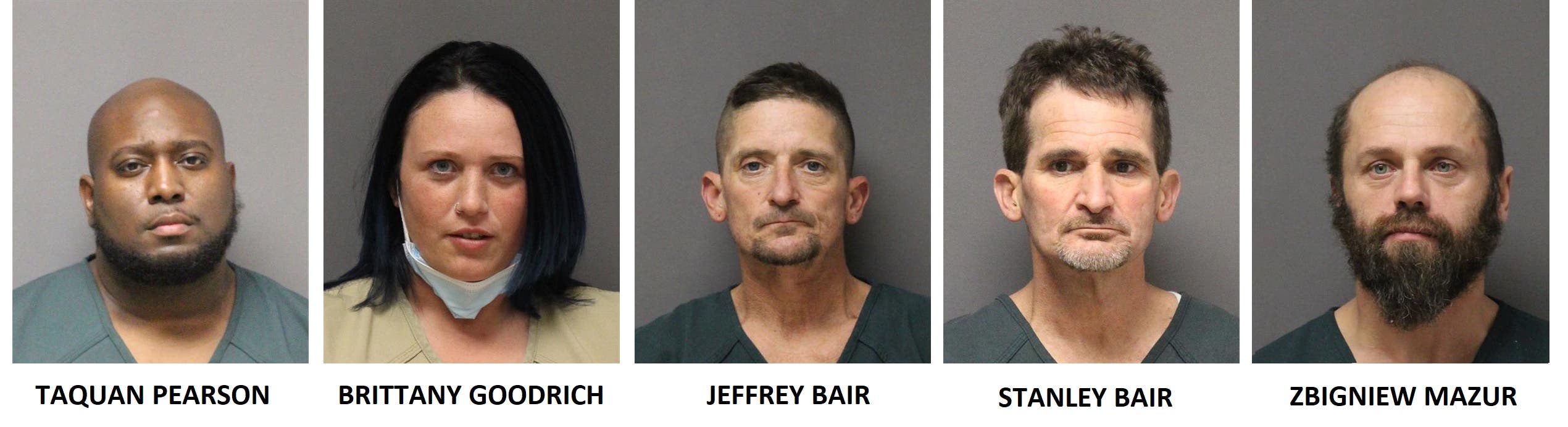 Taquan Pearson, 30, Brittany Goodrich, 29, Jeffrey Bair, 51, and Zbigniew Mazur, 38, all of Barnegat, and Stanley Bair, 60, of Waretown, are being held at the Ocean County Jail, Toms River.