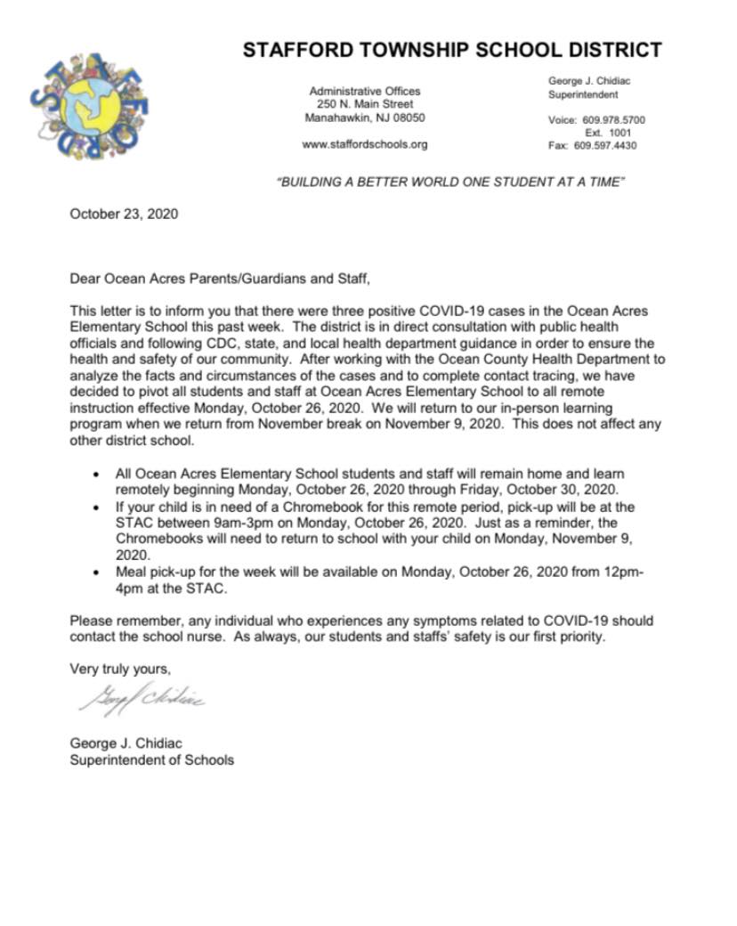 Ocean Acres Elementary School will go remote next week and return to in-person schooling Nov. 9, after the November break.