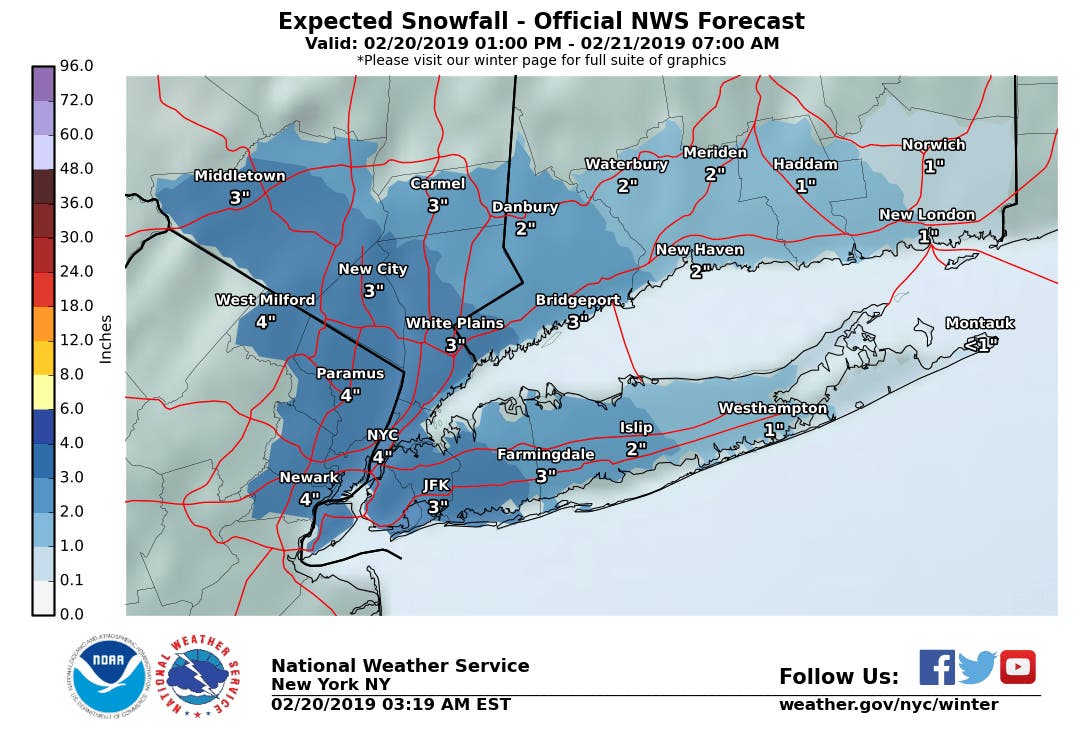 The National Weather Service also provided estimates for the snow, saying the state will get anywhere from 2 to 5 inches between 7 a.m. and 8 p.m. on Wednesday (see below). A winter weather advisory has been issued in all 21 New Jersey counties, with the majority of the snow falling between 2 and 5 p.m.