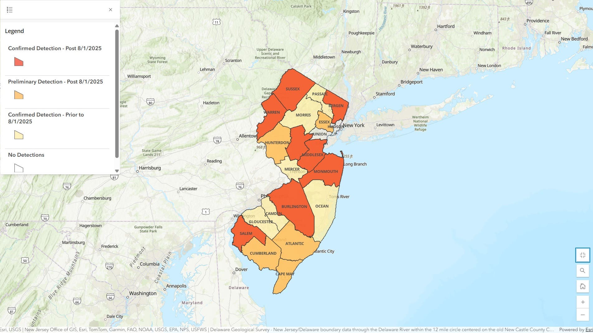 Red shown on the map above indicates "Confirmed Detection - Post 8/1/2025." Orange indicates "Preliminary Detection - Post 8/1/2025," and yellow indicates "Confirmed Detection - Prior to 8/1/2025."