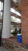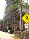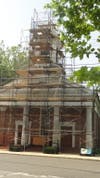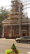Anyone who entered the center of town last week was greeted by a rather startling sight of the familiar church, which stands in prime location at the head of the town green, at 1 E. Oak Street at the head of the town green. The front is covered in scaffolding and netting and, of course, workers busy at the job.