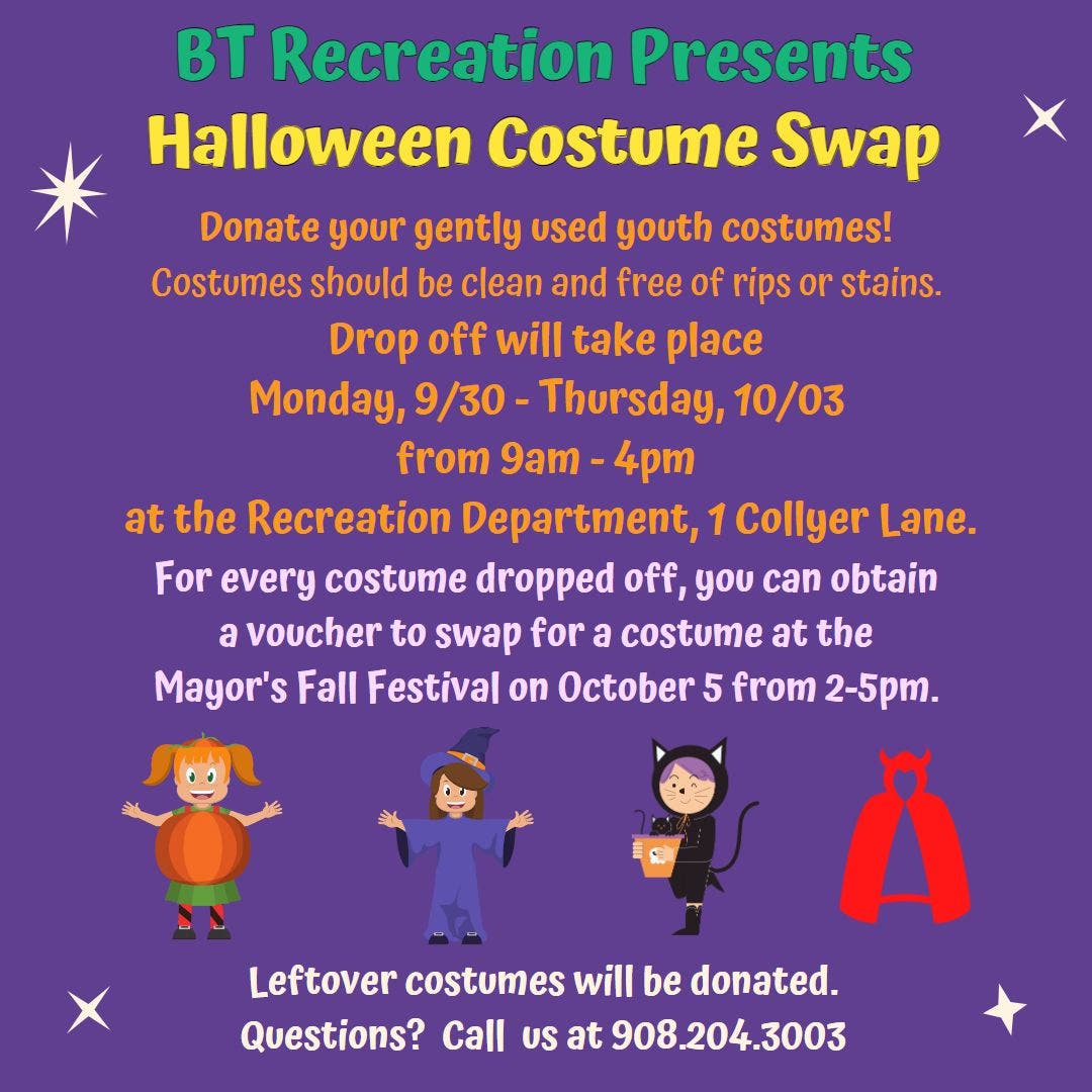 Costumes, that are clean and free of rips and stains, can be dropped off from Sept. 30 to Oct. 3 from 9 a.m. to 4 p.m. at the Recreation Department at 1 Collyer Lane.