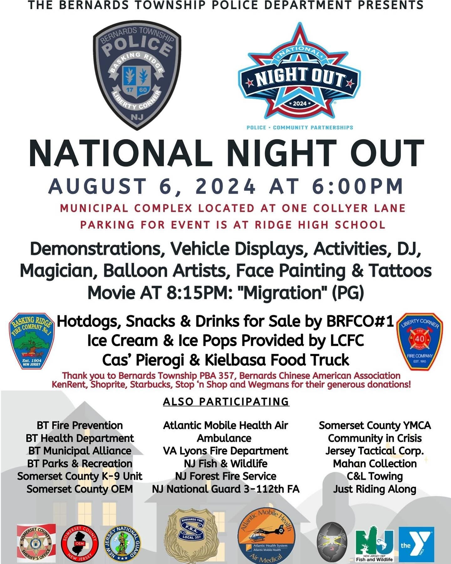 BASKING RIDGE, NJ — The Bernards Township Police Department is hosting the annual National Night Out on Aug. 6 at 6 p.m. at the Municipal Complex at One Collyer Lane.