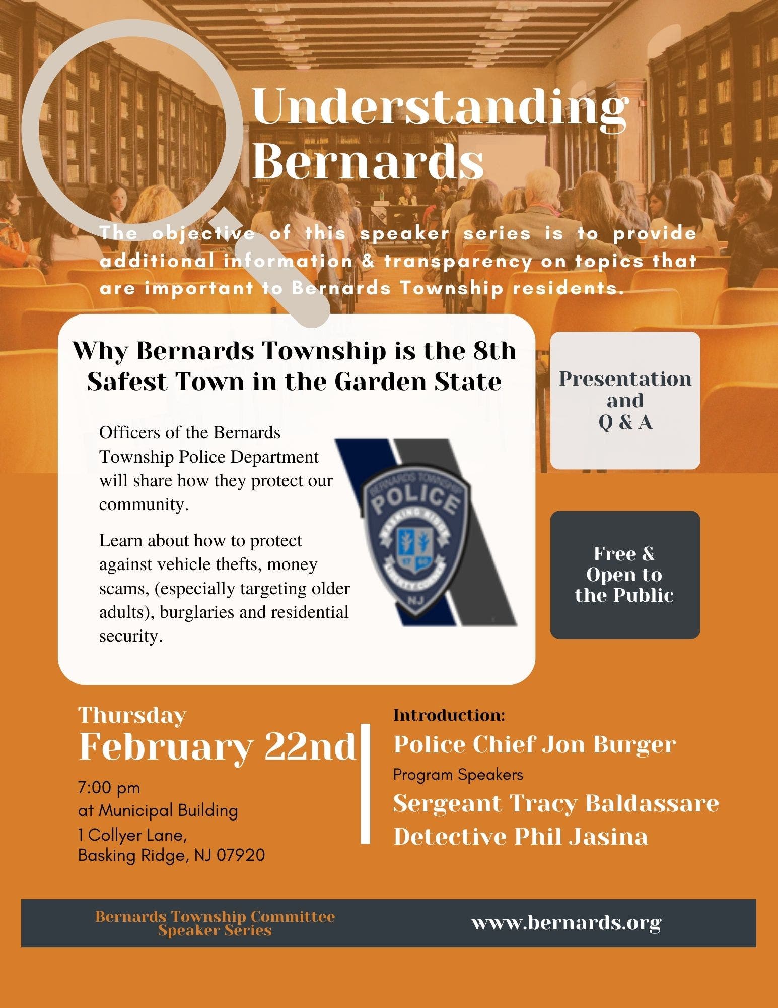 Bernards Township Police Chief Jon Burger along with Sergeant Tracey Baldassare and Detective Phil Jasina will be presenting the presentation called "Why Bernards Township is 8th Safest Town in the Garden State?"