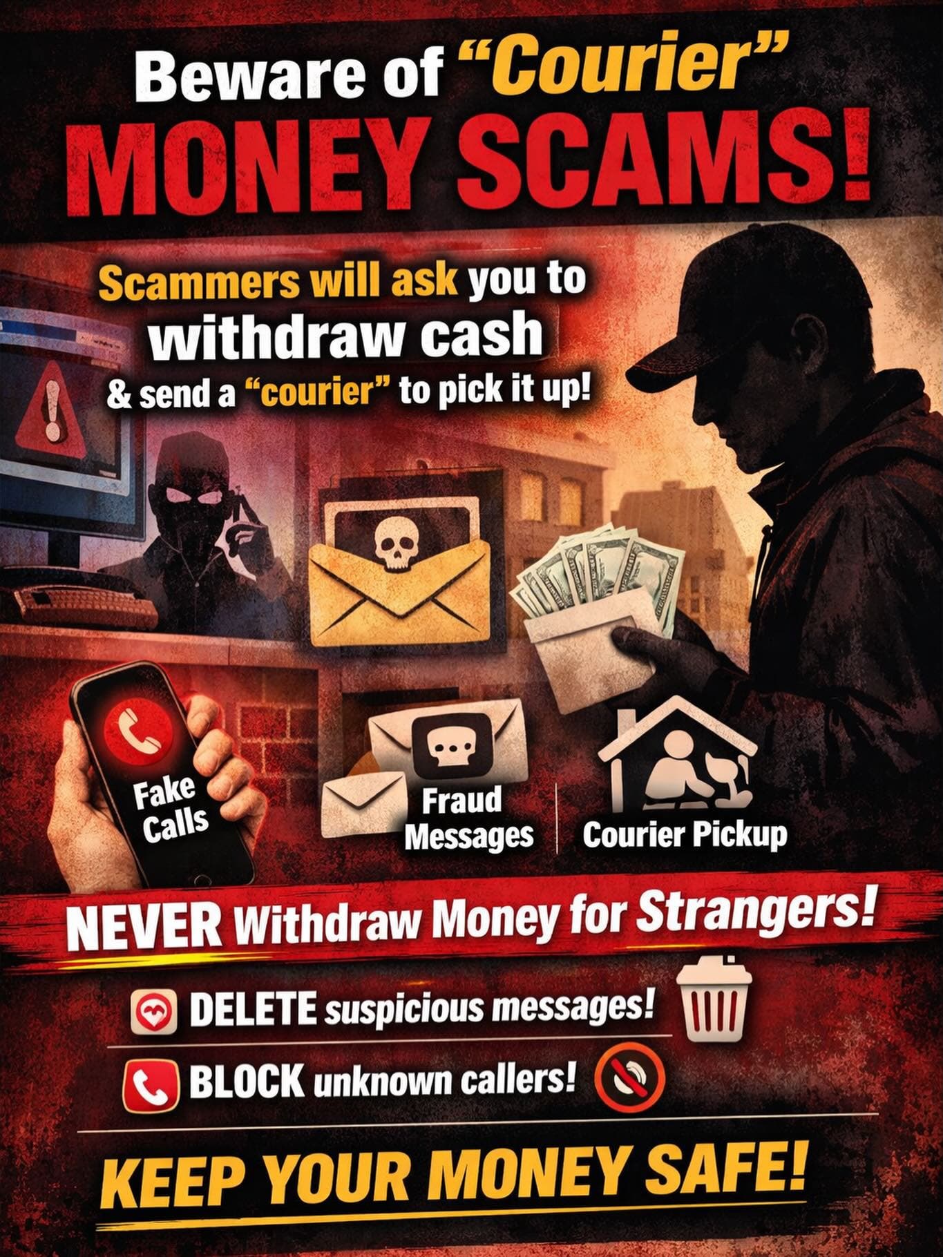 Scammers posing as banks or officials tell victims to withdraw cash, then send a courier to collect it.